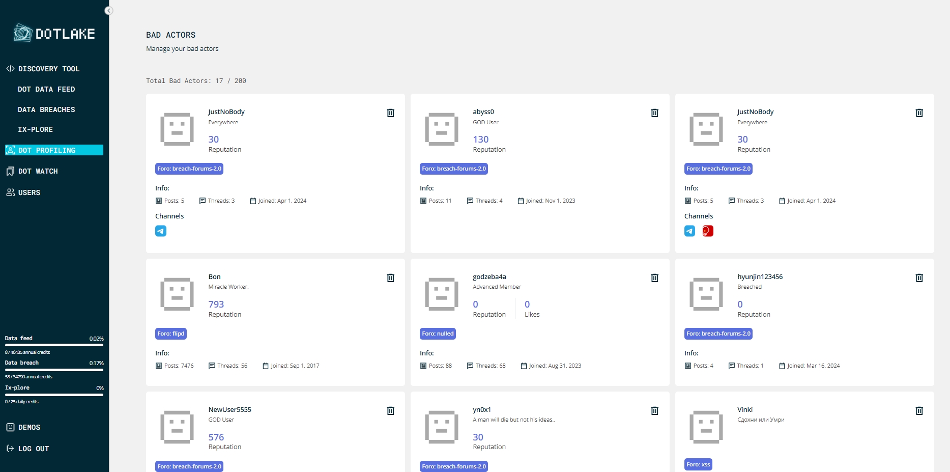 Dotlake provides real-time visibility into crucial criminal sources on the open and deep web, including ransom sites, fraud marketplaces, telegram groups and channels, and most relevant cybercrime forums in the world of cybercrime.