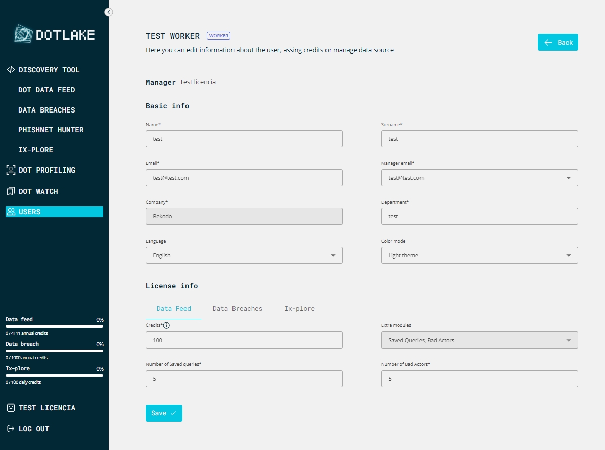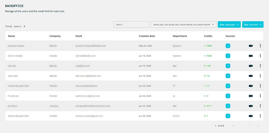 Within this panel you can create new Workers, which are those users attached to your license and to whom you can distribute the total amount of credits that the license has: In the table you can see the name of the user, if they are active and the amount of credits they have consumed.